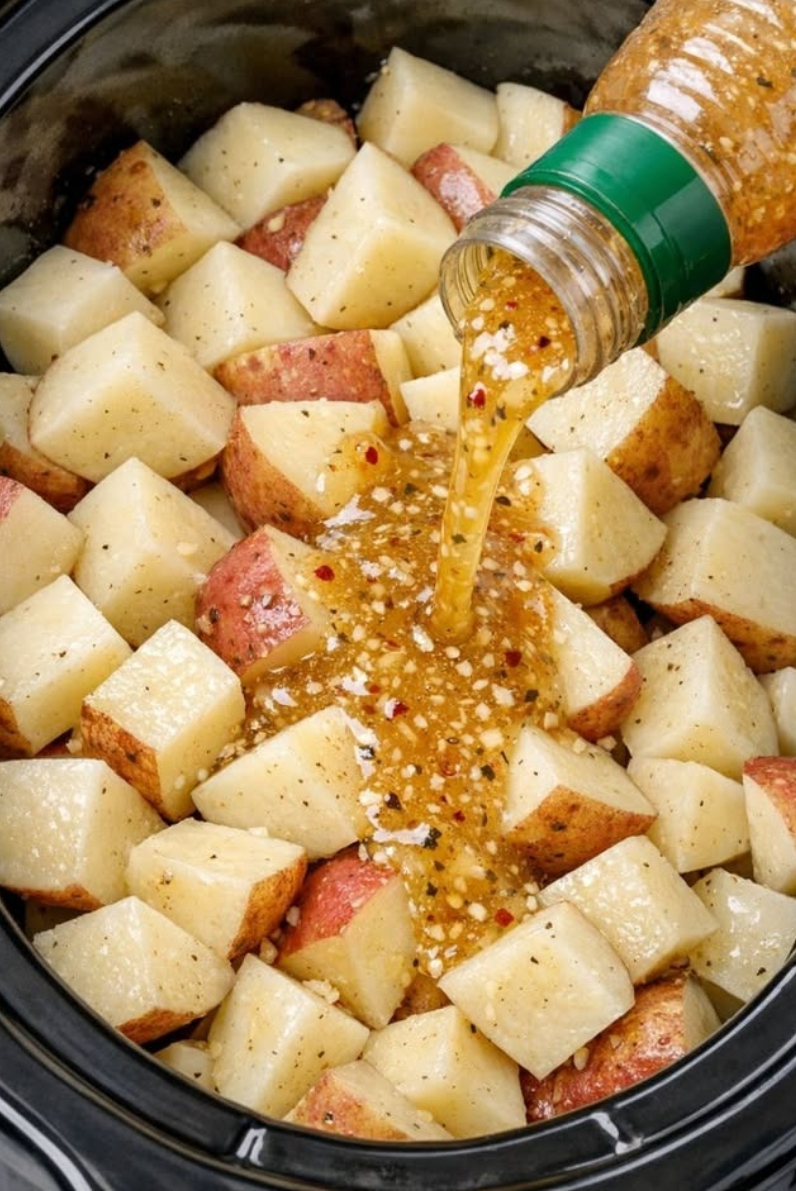 Using bottled Italian salad dressing is a very Midwestern kind of shortcut: practical, thrifty, and surprisingly flavorful. The herbs, garlic, and tangy vinegar soak into the potatoes as they cook, giving you something that tastes like you fussed, even when you didn’t.Cookware & Diningware