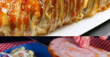 Bacon-Wrapped Cheese and Ham Stuffed Meatloaf with Potato Salad