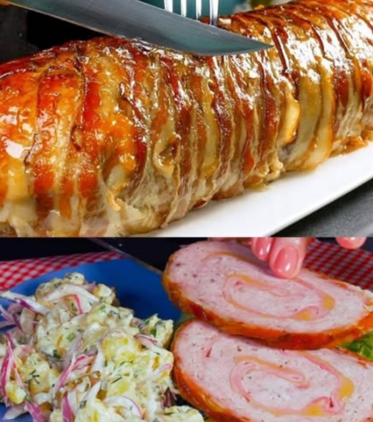 This decadent meatloaf, wrapped in bacon and stuffed with cheese and ham, is paired with a refreshing potato salad. Perfect for a hearty dinner or a special occasion, this meal is sure to impress.