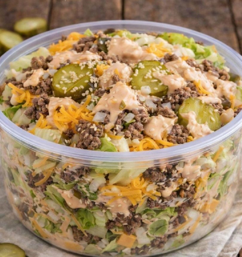 Divide salad between plates, top with ground beef, cheddar cheese, diced onion and pickles. Drizzle salad dressing over salad and top with sesame seeds and enjoy.