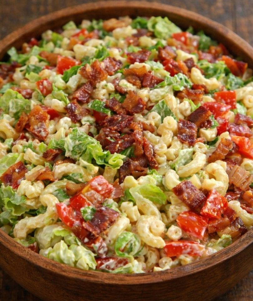 Before serving, add lettuce and bacon and toss.