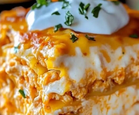 Let the lasagna rest for 8–10 minutes before slicing. Top with optional ranch dressing, green onions, and blue cheese crumbles if desired.