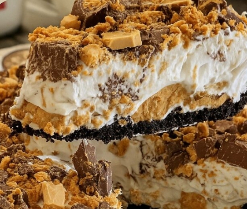 Before serving, sprinkle the chopped Butterfinger candy bars over the top of the pie. Slice and enjoy!