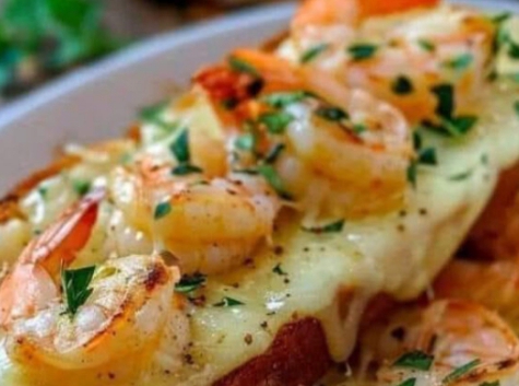 On one half of the garlic bread, layer the cooked shrimp and sprinkle with Monterey Jack cheese.