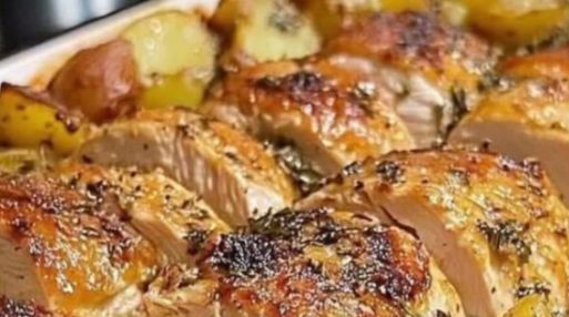 6. Bake: Cover the baking dish with aluminum foil and place it in the preheated oven. Bake for about 45 minutes. After that, remove the foil and bake for an additional 15-20 minutes, or until the chicken is cooked through and the potatoes are tender.