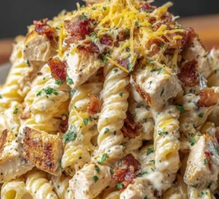 Add cooked pasta, diced chicken, crispy bacon, and remaining cheese. Stir to combine and let simmer for 2–3 minutes until heated through. - Garnish & Serve