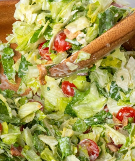 - In a large bowl, toss together iceberg lettuce, romaine lettuce, bacon, cherry tomatoes, and 1/4 cup chives.