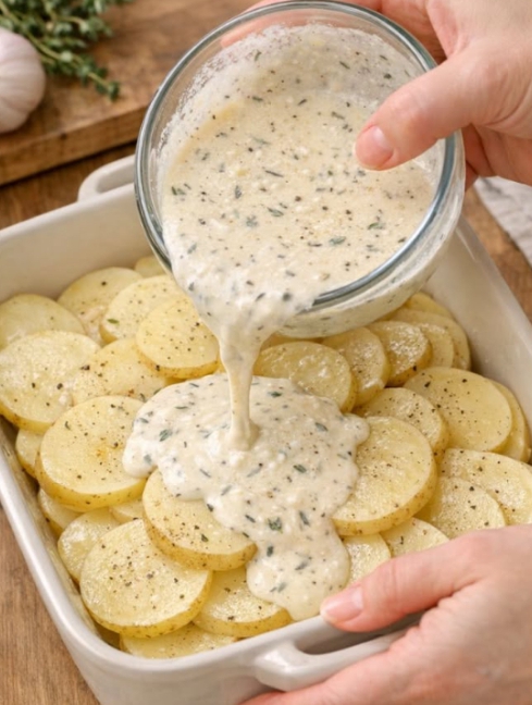 Slowly drizzle cream mixture over potatoes, starting at the edges and working inward. Tilt dish gently to help liquid seep between layers. Do not stir—you’ll disrupt the delicate layering.