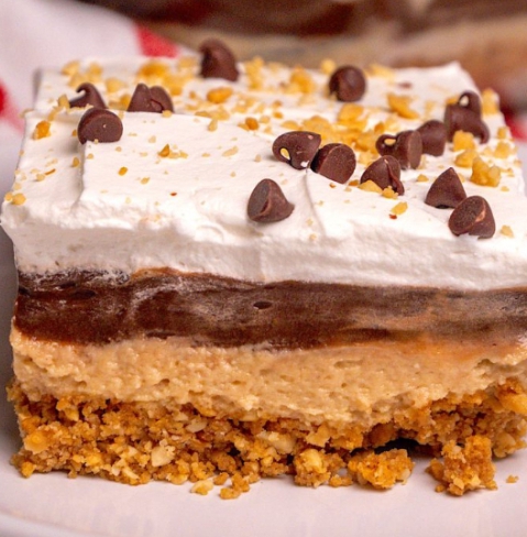 - For the chocolate layer: In a large bowl, add pudding mixture and milk. Mix until the pudding begins to thicken, about 1-2 minutes. Gently spread the chocolate mixture over the peanut butter layer.