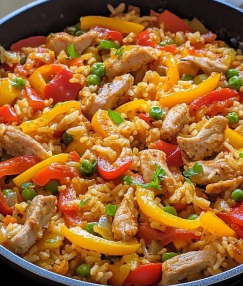 Olivenöl in einer Pfanne erhitzen und das Hähnchen kräftig anbraten. Mit Salz und Pfeffer würzen. Paprika und Knoblauch zugeben und kurz mitbraten.