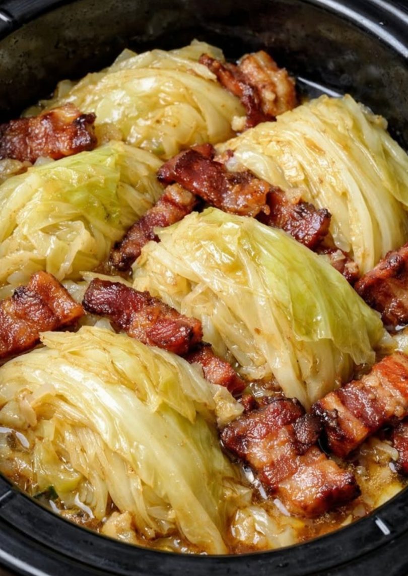 My grandfather taught me this simple bowl of comfort back when our winters felt longer and the days on the farm felt a whole lot harder. He believed that you didn’t need a cupboard full of fancy things to eat well—just good cabbage from the garden, thick-cut bacon from the butcher, a little onion, and a splash of broth. Those four ingredients melt together in the slow cooker into the most flavorful, satisfying pot of braised cabbage you could ever tuck into. The cabbage turns silky and pale gold, the bacon goes deep red and smoky, and the rendered juices coat every wedge. It’s the kind of Midwestern comfort food that fills your kitchen with the smell of home and carries a piece of the past to your table.