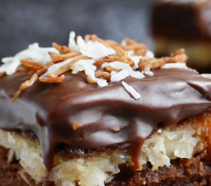 8. Heat the chocolate frosting in the microwave for about 20-30 seconds, or until it reaches a pourable consistency. Pour the frosting evenly over the coconut layer.