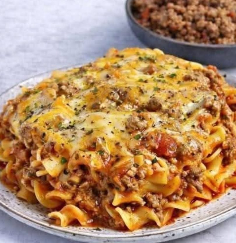 » ½ noodles → ½ cream mix → ½ beef sauce