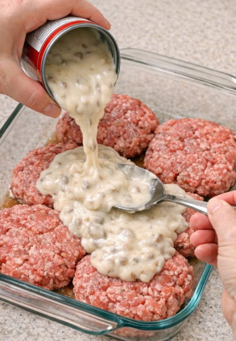 Serve these creamy baked patties with fluffy mashed potatoes or buttered egg noodles to soak up all that mushroom gravy. A side of green beans, steamed peas, or a simple tossed salad helps balance out the richness. Warm dinner rolls or slices of crusty bread are perfect for mopping up the last bit of sauce in the glass dish. For a fuller plate, add applesauce or coleslaw on the side—just like a small-town church supper.