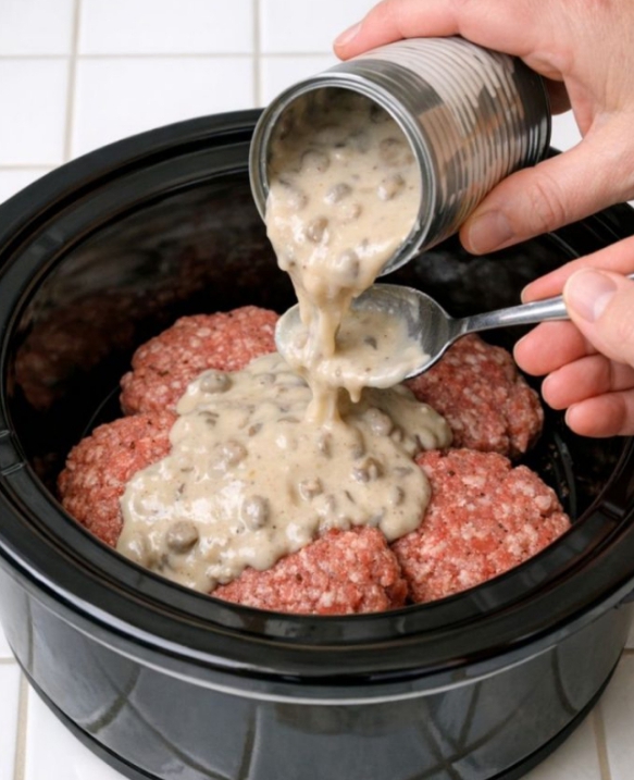 Pour the cream of mushroom soup mixture evenly over the raw hamburger patties in the slow cooker, making sure each patty is covered so they braise gently in the sauce as they cook.