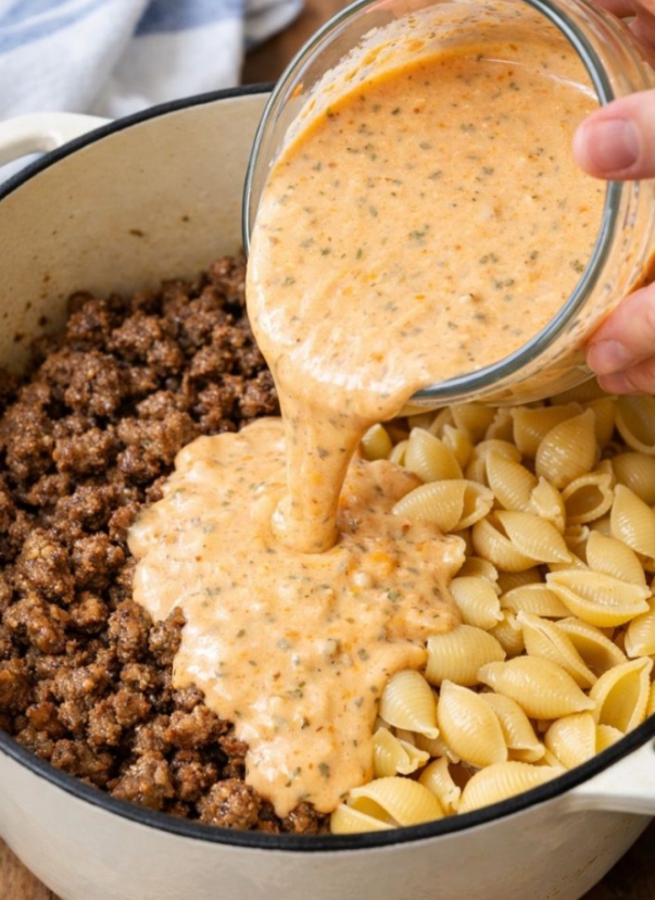 Return the Dutch oven to medium heat. Slowly pour the creamy liquid mixture evenly over the uncooked pasta shells and browned beef in the Dutch oven, making sure to cover as much of the pasta as possible. Use the back of a spoon to gently press any exposed shells down into the liquid so they can cook evenly, but avoid heavy stirring.