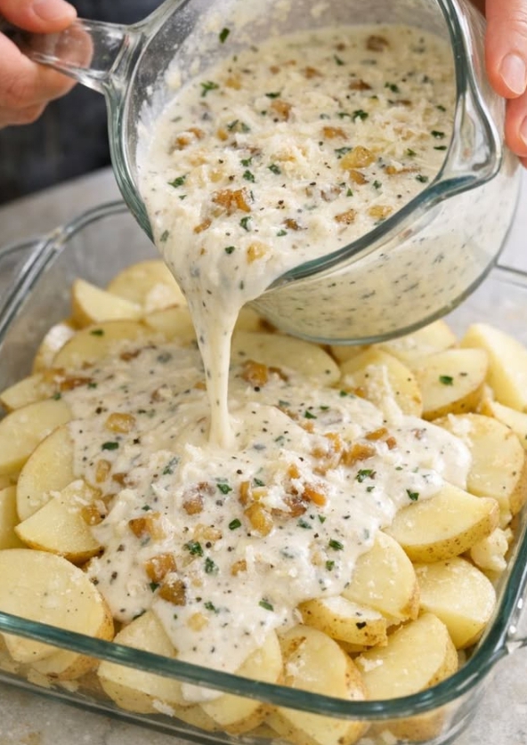 Pour the creamy mixture over the potatoes: Give the creamy pour-over a quick stir, then slowly pour this one creamy mixture all over the raw potatoes in the glass casserole dish, making sure to distribute the onions and herbs as evenly as you can. Gently shake the dish or use a spoon to nudge the potatoes so the cream seeps down between the slices.