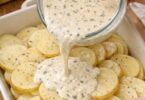 Layer the potatoes in the dish: Arrange the sliced potatoes evenly in the greased glass casserole dish, spreading them out so there are no big clumps. It doesn’t have to be perfect—just aim for an even layer or two so the creamy pour-over can reach everything.
