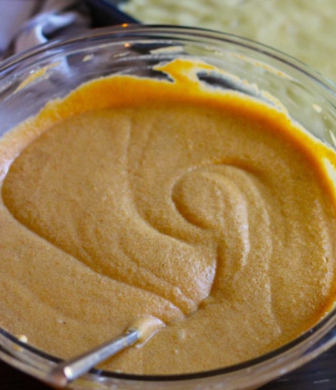 3. In another large bowl, mix together cream cheese and pumpkin puree until smooth. Add eggs, vanilla, and melted butter, then mix until combined.