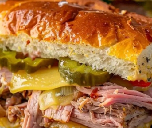 Layer the Swiss cheese, sliced ham, shredded pork, and pickles on the bottom halves of the bread. Add another layer of Swiss cheese, then top wit