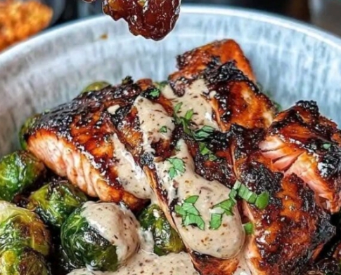 Assemble the Bowls: Serve salmon and Brussels sprouts over rice or quinoa. Drizzle with sauce.