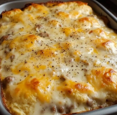 Pour the sausage gravy evenly over the biscuits in the baking dish.
