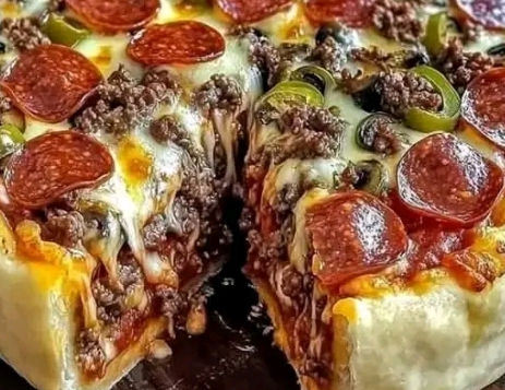 Layer: mozzarella, meat filling, mushrooms, peppers. Repeat layers as desired.
